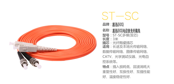 ST-SC光纖跳線為標準的3.0mm直徑光纖跳線,符合 ANSI / TIA / EIA - 568標準。