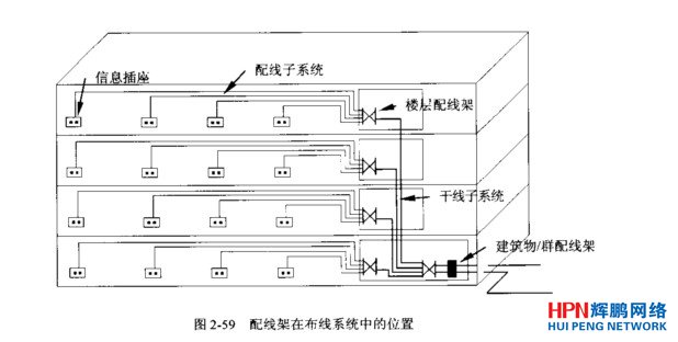 根據配線架所在位置的不同,可將其分為主配線架和中間配線架,前者用于建筑物或建筑群的配線,而后者用于樓層的配線。水平子系統的一端為信息插座,另一端為中間配線架。垂直子系統的一端為中間配線架,另一端為主配線架,或者兩端均為集線設備。如所示為配線架在綜合布線系統中的具體位置。