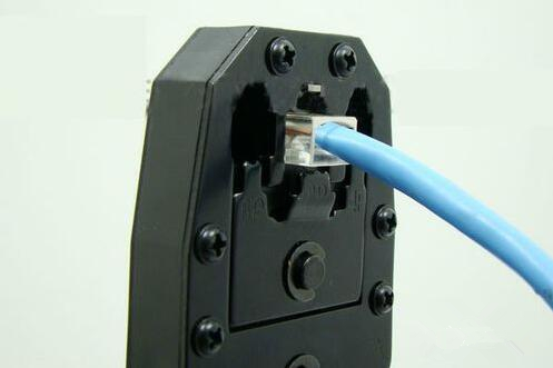 5、把帶網線的水晶頭放入網線鉗的壓線槽內,緊緊用力握住,以保證金屬針腳能夠和網線良好接觸。