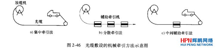 分散牽引法:不用終端牽引機,而是用2~3部輔助牽引機完成光纜敷設。