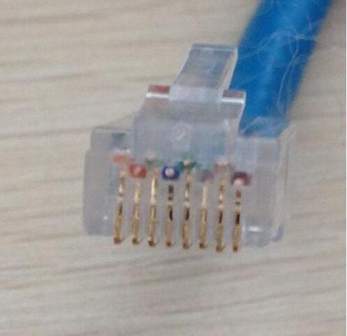 六類網線的水晶頭是錯層排列,就是分兩排,上面四根,下面四根.超五類網線水晶頭是直線排列。